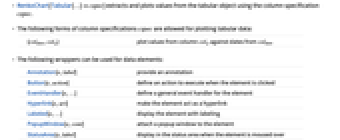 {e1,e2,…} list of elements with or without wrappers w[{e1,e2,…}] wrapper applied to the whole data - RenkoChart[Tabular[…]cspec] extracts and plots values from the tabular object using the column specification cspec.