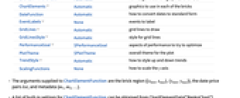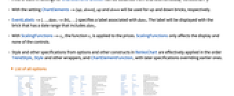 AspectRatio 1/GoldenRatio overall ratio of height to width Axes True whether to draw axes ChartBaseStyle Automatic overall style for bricks ChartElementFunction Automatic how to generate raw graphics for bricks ChartElements Automatic graphics to use in each of the bricks DateFunction Automatic how to convert dates to standard form EventLabels None events to label GridLines Automatic grid lines to draw GridLinesStyle Automatic style for grid lines PerformanceGoal $PerformanceGoal aspects of performance to try to optimize PlotTheme $PlotTheme overall theme for the plot TrendStyle Automatic how to style up and down trends ScalingFunctions None how to scale the