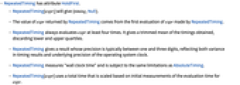 - RepeatedTiming gives a result whose precision is typically between one and three digits, reflecting both variance in timing results and underlying precision of the operating system clock.