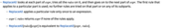 - ReplaceAll looks at each part of expr, tries all the rules on it, and then goes on to the next part of expr. The first rule that applies to a particular part is used; no further rules are tried on that part or on any of its subparts.