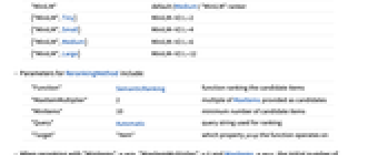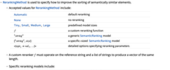 Automatic default reranking None no reranking Tiny, Small, Medium, Large predefined model sizes f a custom reranking function "string" a generic SemanticRanking model {"string",size} a specific-sized SemanticRanking model <|opt1val1,…|> detailed options specifying reranking parameters - A custom reranker f must operate on the reference string and a list of strings to produce a vector of the same length.