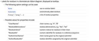 None use no residue labels Automatic automatically label residues {"prop1","prop2",…} a list of residue properties - Possible values for properties include: