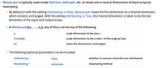 - By default or with the setting InterleavingFalse, ResizeLayer treats the first dimension as a channel dimension, which remains unchanged. With the setting InterleavingTrue, the channel dimension is taken to be the last dimension of the input and output arrays.