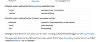Automatic automatic choice depending on the method "Point" point sampling "Bin" bin sampling - Settings for the "Scheme" parameter have the same meaning as those in the third argument of ArrayResample.