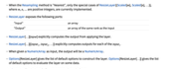 "Input" an array "Output" an array of the same rank as the input - ResizeLayer[…][input] explicitly computes the output from applying the layer.