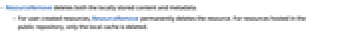 - For user-created resources, ResourceRemove permanently deletes the resource. For resources hosted in the public repository, only the local cache is deleted.