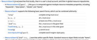 - In ResourceSearch["query",…] the query is compared against multiple resource metadata properties, including "Keywords", "Description", "Details" and "Name".