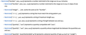 - Restricted["Number",{min,max,step}] represents a number restricted to the range min to max in steps of size step.