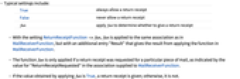 True always allow a return receipt False never allow a return receipt fun apply fun to determine whether to give a return receipt - With the setting ReturnReceiptFunction->fun, fun is applied to the same association as in MailReceiverFunction, but with an additional entry "Result" that gives the result from applying the function in MailReceiverFunction.
