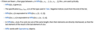 - If there are fewer xi than gaps between ei in Riffle[{e1,e2,…},{x1,x2,…}], the xi are used cyclically.