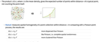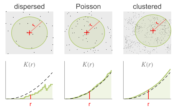 - RipleyK measures spatial homogeneity of a point collection within distance r. In comparing with a Poisson point process, the results are: