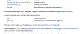 {p1,p2,…} points pi GeoPosition[…],GeoPositionXYZ[…],… geographic points SpatialPointData[…] spatial point collection {pts,reg} point collection pts and observation region reg - If the observation region reg is not given, a region is automatically computed using RipleyRassonRegion.