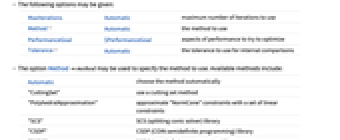 MaxIterations Automatic maximum number of iterations to use Method Automatic the method to use PerformanceGoal $PerformanceGoal aspects of performance to try to optimize Tolerance Automatic the tolerance to use for internal comparisons - The option Methodmethod may be used to specify the method to use. Available methods include: