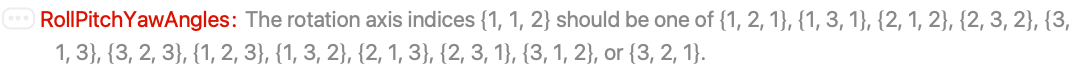 However, RollPitchYawAngles requires consecutive axes to be distinct: