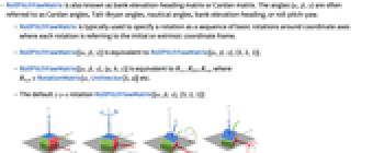 - RollPitchYawMatrix[{α,β,γ},{a,b,c}] is equivalent to