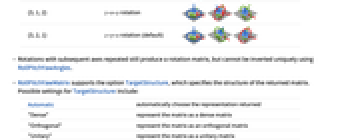 Automatic automatically choose the representation returned "Dense" represent the matrix as a dense matrix "Orthogonal" represent the matrix as an orthogonal matrix "Unitary" represent the matrix as a unitary matrix - RollPitchYawMatrix[…,TargetStructureAutomatic] is equivalent to RollPitchYawMatrix[…,TargetStructure"Dense"].