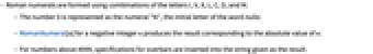 - RomanNumeral[n] for a negative integer n produces the result corresponding to the absolute value of n.