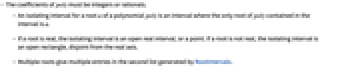 . - If a root is real, the isolating interval is an open real interval, or a point. If a root is not real, the isolating interval is an open rectangle, disjoint from the real axis.