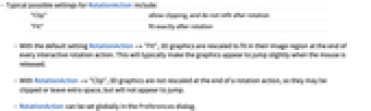 - With RotationAction->"Clip", 3D graphics are not rescaled at the end of a rotation action, so they may be clipped or leave extra space, but will not appear to jump.