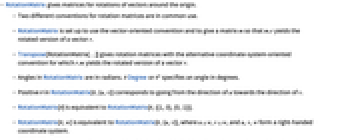- RotationMatrix[θ,w] is equivalent to RotationMatrix[θ,{u,v}], where u⊥w, v⊥w, and u,v,w form a right-handed coordinate system.