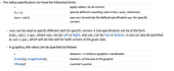 r distance r in ordinary graphics coordinates Scaled[s], ImageScaled[s] fraction s of the size of the graphic Offset[d] d printer's points - For constructs such as Framed, RoundingRadius->r always specifies the radius in absolute printer's points.