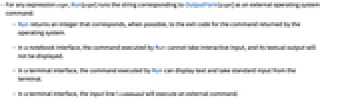 - For any expression expr, Run[expr] runs the string corresponding to OutputForm[expr] as an external operating system command.