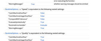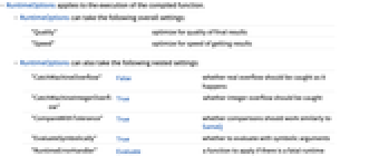"CatchMachineOverflow" False "CatchMachineIntegerOverflow" False "CompareWithTolerance" False "EvaluateSymbolically" True "RuntimeErrorHandler" Evaluate "WarningMessages" True - RuntimeOptions->"Quality" is equivalent to the following nested settings: