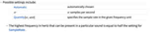Automatic automatically chosen sr sr samples per second Quantity[sr,unit] specifies the sample rate in the given frequency unit - The highest frequency in hertz that can be present in a particular sound is equal to half the setting for SampleRate.