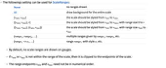 None no ranges drawn All draw background for the entire scale {vmin,vmax} the scale should be styled from vmin to vmax {{vmin,vmax},r} the scale should be styled from vmin to vmax, with range size 0 to r {{vmin,vmax},{rmin,rmax}} the scale should be styled from vmin to vmax, with range size rmin to rmax {range1,range2,…} multiple ranges given by range1, range2, etc. {range1->s1,…} range range1 with style s1 etc. - By default, no scale ranges are drawn on gauges.