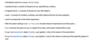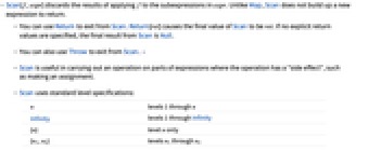 n levels 1 through n Infinity levels 1 through Infinity {n} level n only {n1,n2} levels n1 through n2 - The default value for levelspec in Scan is {1}.