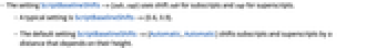 - A typical setting is ScriptBaselineShifts->{0.6,0.9}.