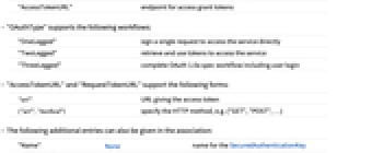 "OAuthVersion" "1.0a" "ConsumerKey" consumer key or application client ID "ConsumerSecret" consumer secret or application client secret "OAuthType" OAuth workflow type "RequestTokenURL" endpoint for temporary request tokens "AccessTokenURL" endpoint for access grant tokens - "OAuthType" supports the following workflows: