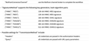 {"HMAC","MD2"} 128-bit HMAC-MD2 signature {"HMAC","MD5"} 128-bit HMAC-MD5 signature {"HMAC","SHA1"} 160-bit HMAC-SHA1 signature {"HMAC","SHA256"} 256-bit HMAC-SHA256 signature {"HMAC","SHA384"} 384-bit HMAC-SHA384 signature {"HMAC","SHA512"} 512-bit HMAC-SHA512 signature - Possible settings for "TransmissionMethod" include: