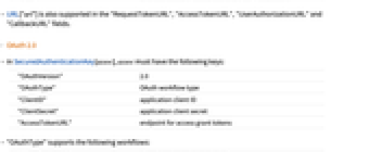 "OAuthVersion" 2.0 "OAuthType" OAuth workflow type "ClientID" application client ID "ClientSecret" application client secret "AccessTokenURL" endpoint for access grant tokens - "OAuthType" supports the following workflows: