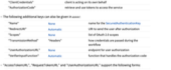 "Name" None name for the SecuredAuthenticationKey "RedirectURI" Automatic URI to send the user after authorization "Scopes" None list of OAuth 2.0 scopes "TransmissionMethod" "Headers" how credentials are passed during the workflow "UserAuthorizationURL" None endpoint for user authorization "VerifierInputFunction" Automatic function that handles the authorization code - "AccessTokenURL", "RequestTokenURL" and "UserAuthorizationURL" support the following forms: