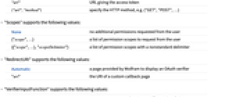 "url" URL giving the access token {"url","method"} specify the HTTP method, e.g. ("GET","POST",…) - "Scopes" supports the following values:
