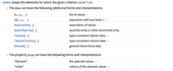 {e1,e2,…} list of values » f[e1,e2,…] expression with any head f » Association[…] association of values » QuantityArray[…] quantity array or other structured array Tabular[…] type‐consistent tabular data » TabularColumn[…] type‐consistent column data » Dataset[…] general hierarchical data - The property prop can have the following forms and interpretations: