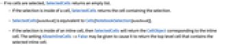 - If the selection is inside of an inline cell, then SelectedCells will return the CellObject corresponding to the inline cell. The setting AllowInlineCells->False may be given to cause it to return the top-level cell that contains the selected inline cell.