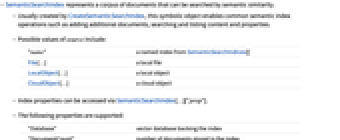 "name" a named index from SemanticSearchIndices[] File[…] a local file LocalObject[…] a local object CloudObject[…] a cloud object - Index properties can be accessed via SemanticSearchIndex[…]["prop"].