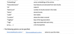 "Database" vector database backing the index "DocumentCount" number of documents stored in the index "Embeddings" vector embeddings of the entries "FeatureExtractor" how features are extracted from text chunks "ID" index ID "ItemCount" number of chunks stored in the index "Items" stored chunks "Label" item labels "Location" where the index is stored "TagKeys" keys of the tag association "Tags" tags associated with each entry {prop1,…} a list of properties - The following options can be specified: