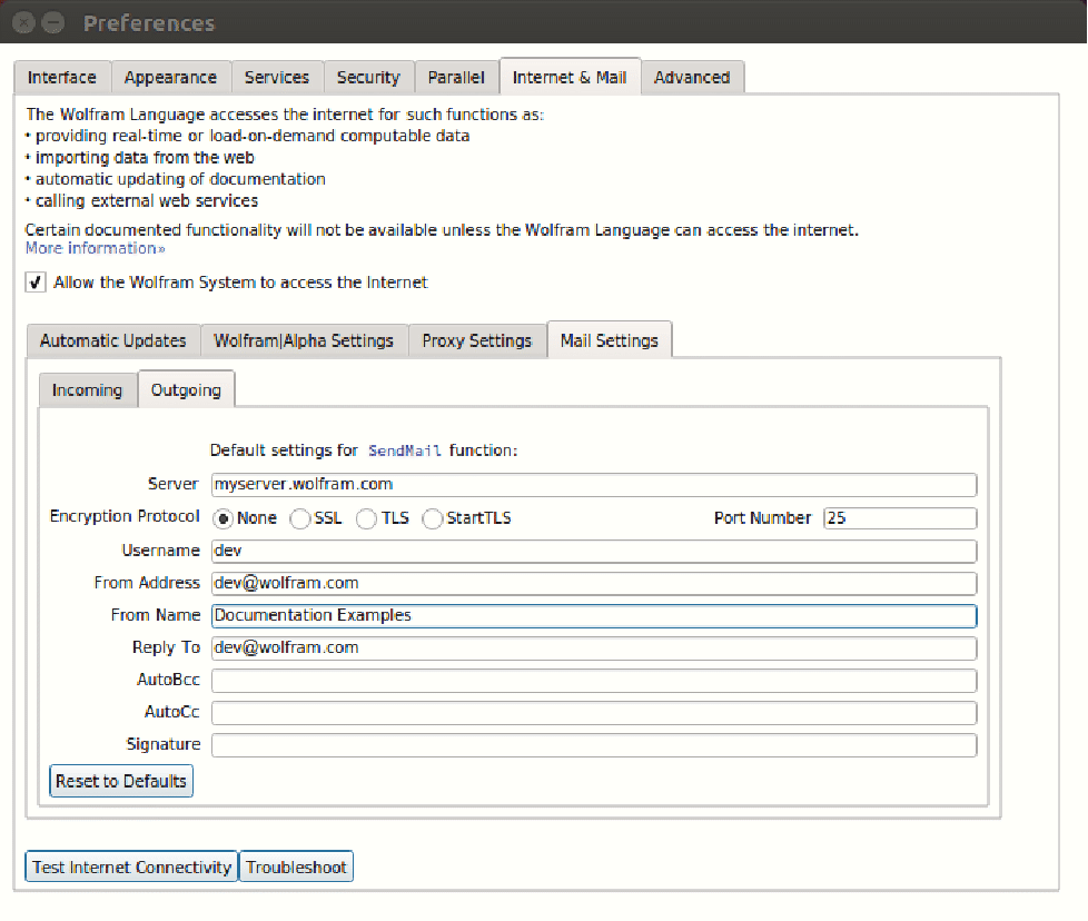 - On desktop systems, SendMail requires certain user mail settings. These can be defined through Preferences ▶ Internet & Mail ▶ Mail Settings in the notebook front end or by using SetOptions[SendMail,MailSettings]. SendMail will attempt to send email via the Wolfram Cloud if these settings have not been provided. »