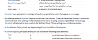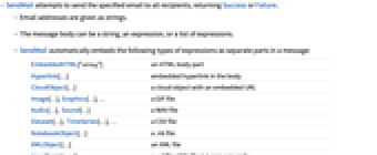 EmbeddedHTML["string"] an HTML body part Hyperlink[…] embedded hyperlink in the body CloudObject[…] a cloud object with an embedded URL Image[…],Graphics[…],… a GIF file Audio[…], Sound[…] a WAV file Dataset[…], TimeSeries[…],… a CSV file NotebookObject[…] a .nb file XMLObject[…] an XML file InputForm[expr] a .wl file of Wolfram Language code ExportForm[expr,"fmt"] a file in the format specified by "fmt" expr raster image file of the formatted form of expr {expr1,expr2,…} a sequence of email body parts - SendMail uses appropriate encodings to handle any special characters that appear in a message.