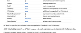 "To" {} email addresses of primary recipients "Cc" {} email addresses of secondary recipients "Bcc" {} email addresses of hidden recipients "Subject" None message subject line "Body" None main message body "TextBody" None additional message body for text clients "HTMLBody" None additional message body for HTML clients "AttachedExpressions" {} expressions to send as attachments "AttachedFiles" {} files to send as attachments "Priority" Automatic email priority "ReturnReceipt" None where to send a return receipt - If "Body" is specified, it is included in the message before "TextBody" and "HTMLBody".