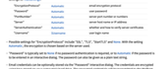 "EncryptionProtocol" Automatic email encryption protocol "Password" Automatic user password "PortNumber" Automatic server port number or numbers "Server" Automatic server host name or IP address "ServerAuthentication" Automatic whether and how to verify server certificates "Username" $Username user login name - Possible settings for "EncryptionProtocol" include "SSL", "TLS", "StartTLS" and None. With the setting Automatic, the encryption is chosen based on the server used.