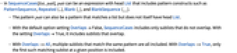 - In SequenceCases[list,patt], patt can be an expression with head List that includes pattern constructs such as PatternSequence, Repeated (..), Blank (_), and BlankSequence (__).