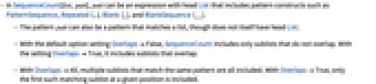 - With OverlapsAll, multiple sublists that match the same pattern are all included. With OverlapsTrue, only the first such matching sublist at a given position is included.