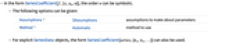 Assumptions $Assumptions assumptions to make about parameters Method Automatic method to use - For explicit SeriesData objects, the form SeriesCoefficient[series,{nx,ny,…}] can also be used.