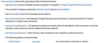 - ServiceConnect["service","id"] attempts to restore connection with the specified ID. If the connection cannot be restored, a new connection will be created with the provided ID.