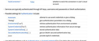 Automatic attempt to use saved credentials or give a dialog "Dialog" give authentication parameters via a dialog Environment["var"] retrieve authentication from environment variables SystemCredential["key"] retrieve authentication information from secure storage SystemCredentialData[…] stored authentication data SecuredAuthenticationKey[…] give an OAuth-secured authentication key assoc provide explicit credentials - Use delayed settings such as Authentication:>SystemCredential["key"] to delay the evaluation of stored credentials.