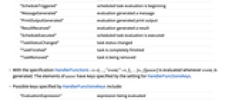"TaskStarted" task is started "ScheduleTriggered" scheduled task evaluation is beginning "MessageGenerated" evaluation generated a message "PrintOutputGenerated" evaluation generated print output "ResultReceived" evaluation generated a result "ScheduleExecuted" scheduled task evaluation is executed "TaskStatusChanged" task status changed "TaskFinished" task is completely finished "TaskRemoved" task is being removed - With the specification HandlerFunctions-><|…,"eventi"->fi,…|>, fi[assoc] is evaluated whenever eventi is generated. The elements of assoc have keys specified by the setting for HandlerFunctionsKeys.